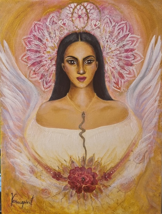 Obraz ten, kojarzy mi się nie tylko z kobiecą energią, ale również z wew ogniem, alchemią, niewinnością i ma w sobie również energie Marii Magdaleny, kiedy ją malowałam, czułam mocno połączenie z nią.